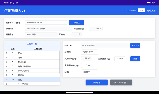 - QRコード読取機能により、対象ロットをすばやく呼び出し、素材情報や作業指示を即時表示可能
