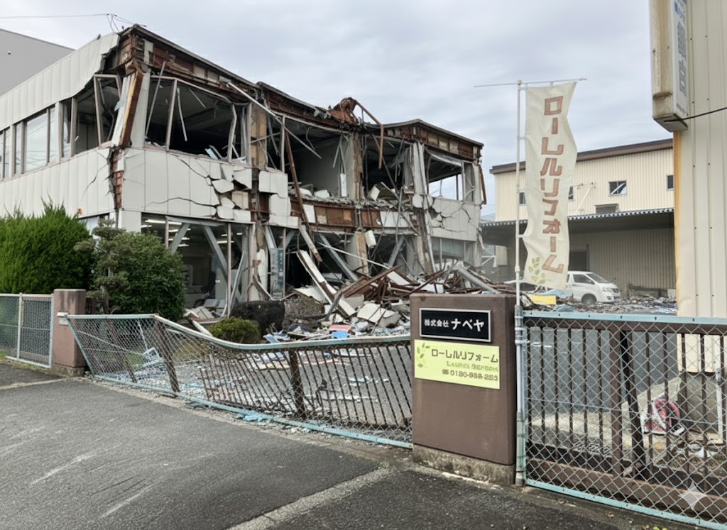道路の破断により、社屋の前の水道管が破裂した模様で、水が噴き出しています